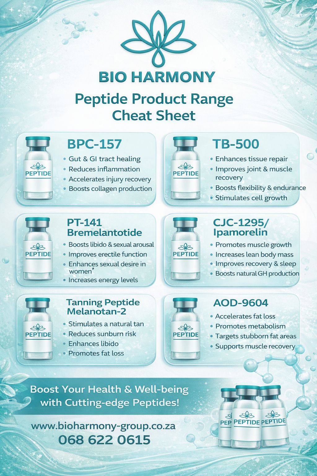 Peptides are transforming the world of health, recovery, and performance — offering targeted solutions to help your body heal, regenerate, and thrive. At Bio Harmony, our advanced peptide product range is designed to support overall wellness, enhance recovery, and help you achieve your health goals faster and more effectively.