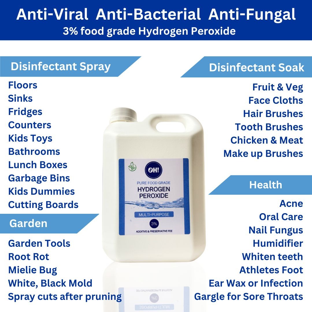 Food Grade hydrogen peroxide is one of the purest forms of hydrogen peroxide and does NOT contain stabilisers, metals or any additives.